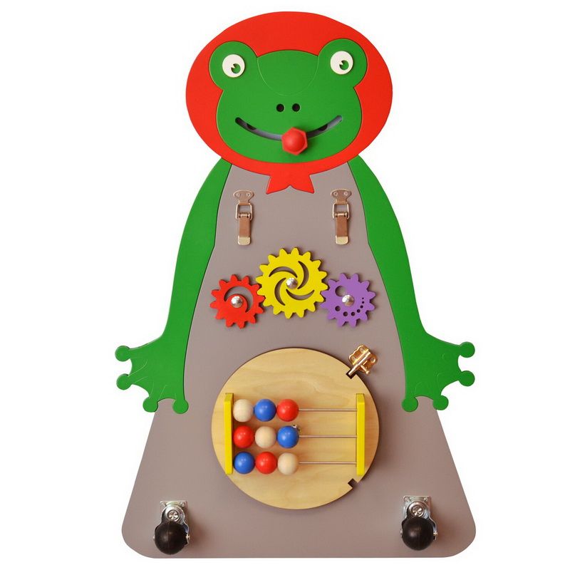 Украсьте игровую зону группы бизибордом «Лягушка-Квакушка». Тактильно-развивающая панель из серии «Теремок» объединяет сразу 6 игровых модулей.