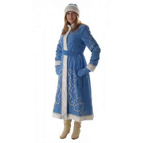 Костюм Снегурочки сшит из корейского голубого бархата. На костюме нанесен орнамент из серебряной тесьмы.