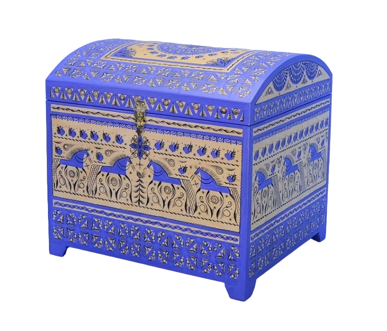 Изготовлен из берёзовой фанеры, расписан гуашевыми и темперными красками, покрыт матовым лаком. Фурнитура - латунь.