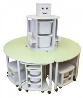Модуль стеллаж включает в себя: центральную часть – «Робот-РОБИК», стол-сектор – 4 шт., тумба – 4 шт., табурет – 4 шт.