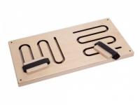 Конструкция фиксируется на стене или используется как напольный модуль. Малыши надевают крепления на руки или на ноги и начинают передвигать фишки по прорезанным траекториям.