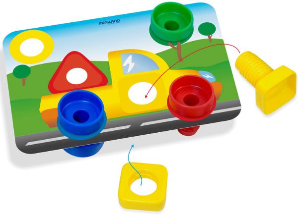 Занимательный набор для малышей на закручивание и завинчивание! Болты и гайки представлены основных цветов и в трех формах: круг, квадрат, треугольник.