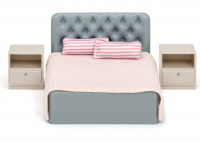 Элементы выполнены в виде роскошной серой 2-х спальной кровати с прикроватными тумбочками и аксессуарами для создания уюта.