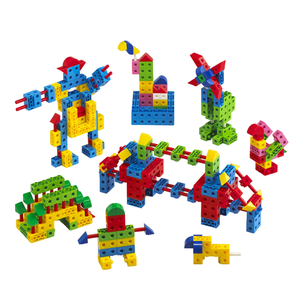 Соединяющиеся кубики имеют отверстия, в которые можно вставлять шипы других кубиков, состыковывая их вместе, плотно и без особых усилий, что позволяет ребенку строить множество разнообразных моделей.