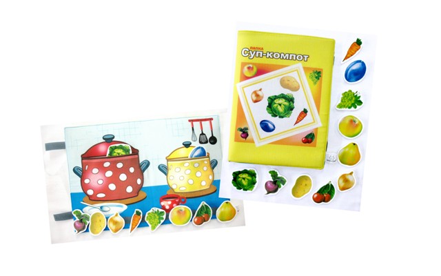 На игровом поле папки расположены 2 кастрюли: одна для супа, вторая для компота. Обе емкости имеют сверху прорезь и представляют собой стилизованный карман. В комплект входят наборы овощей (капуста, свекла, картошка, лук, морковь) и фруктов (вишня, груша, яблоко, виноград, слива). Играя, ребенок должен определить, из чего он будет варить суп, а из чего – компот.