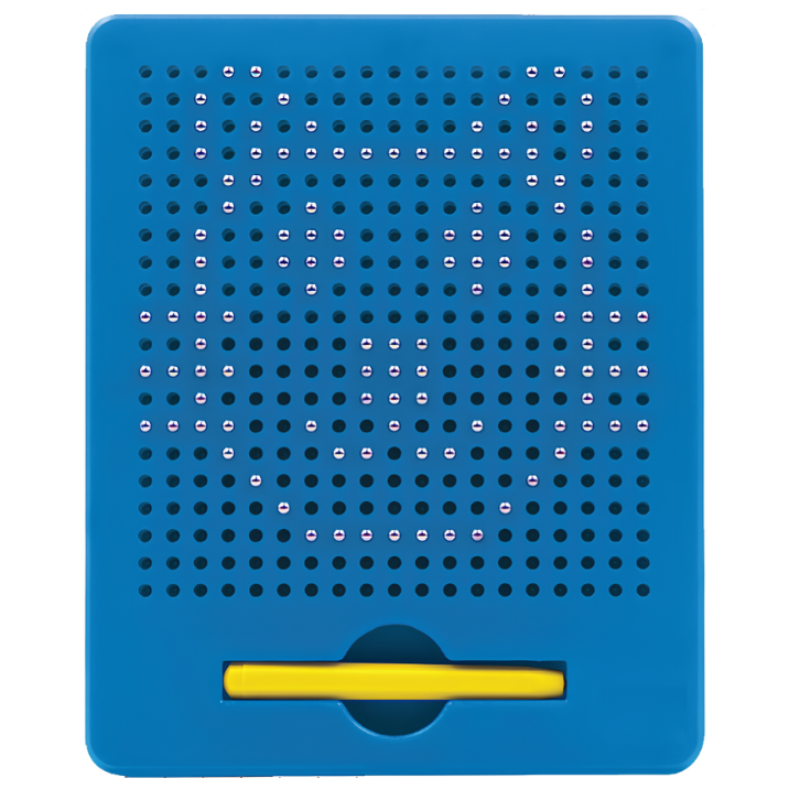 В комплект входит намагниченное перо и доска с ячейками, у которой внутри металлические шарики. И если поднести к одной ячейке перо, то одна из этих бусинок сразу поднимется наверх и займёт место в отверстии. А на планшете как будто будет нарисована точка. Если же провести магнитным пером по доске – получится линия, контур, фигура, цифра, буква и даже полноценная картинка.